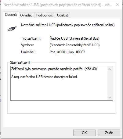 Detail chyby 43 (A request for the USB device descriptor failed.)