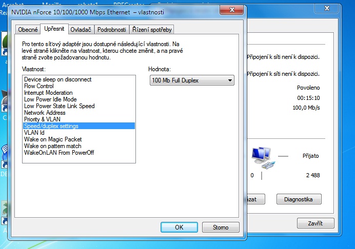 správce zařízení - ve vlastnostech síťovky - advanced - speed & duplex: nastavit 100mbit/full