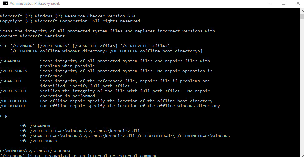 sfc /scannow je příkaz s parametrem, ne dva samostatné příkazy. Takže se to píše do jednoho řádku a pak teprve Enter.