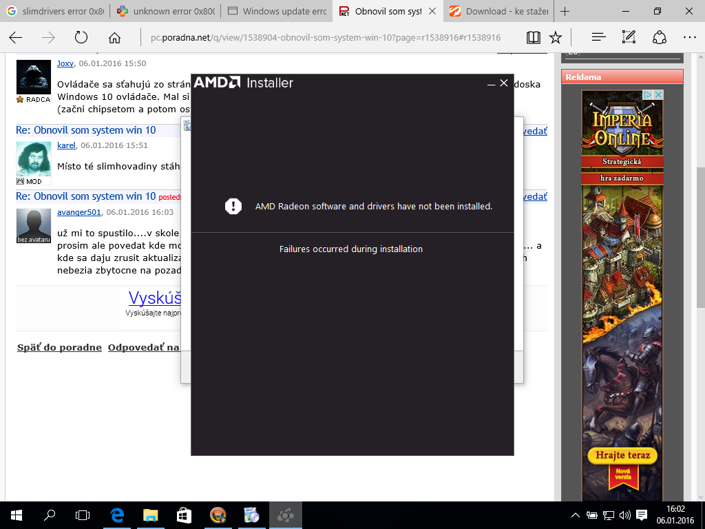 Dnes som aktualizoval pc na win 10...a hneď som dal obnovenie systemu a vsetko vymazal.... ako sa už zapol, stiahol som SLIMDRIVERs,naslo mi 3 veci,dal som ako prvu grafiku a vyhodilo mi chybu error 0x80072EE2, to iste aj pri SM Bus Controller... neviete čo stym?