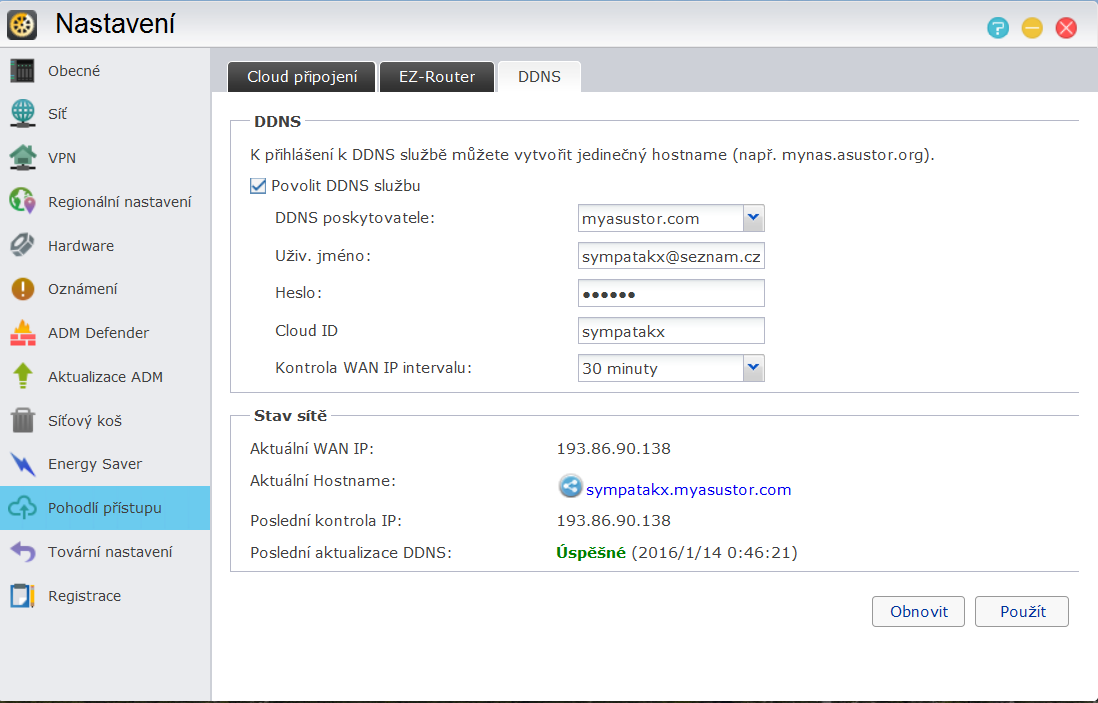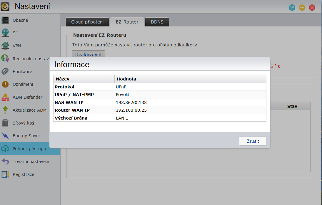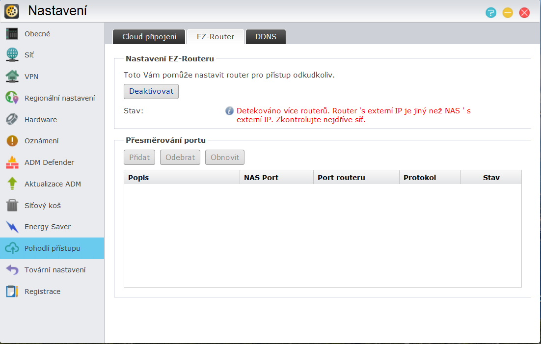 Zdravím, zakoupil jsem NAS ASUSTOR a jsem s ním maxmálně spokojený, až na jednu věc. Nemůžu u něj zprovoznit službu Cloud connect, přístup z venku. Mám neveřejnou dynamickou IP adresu a současně s ním mám NAS Synology a ta samá služba se u Synology jmenuje Quick connect a funguje mi bez problémů. Synology si sám u Quick connectu nastaví přes TP link 1043ND porty ale Asustor zahlásil chybu. Cloud connect mi píše hlášku, že nejde nastavit přeposílání portů, protože není aktivován EZ router. Když však chci v kolonce EZ router pro přístup odkudkoli aktivovat napíše mi to hlášku "Detekováno více routerů. Router s externí IP je jiný než externí IP NAS. Zkontrolujte nejdříve síť." a konec. Zajímavé je, že třeba uTorrent si v Asustaru přes TP link dokáže automaticky nastavit porty, ale Cloud connect ne a nepustí mne dokud si bude myslet, že mám nejspíš na stejné úrovni dva routery. Nevím co s tím, když Synology za stejných podmínek jede. Nevíte někdo prosím, kde by mohla být chybka? Do příloh jsem nahrál jednotlivé hlášky a obrazovky. Díky moc.