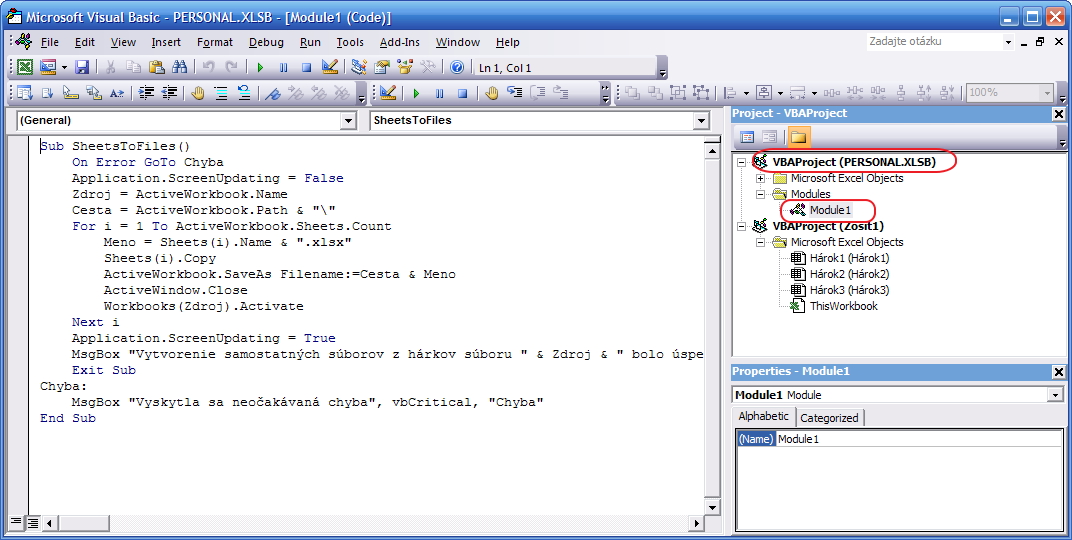 Potom si otvoríš zošit (nesmie byť nový, musí ísť o už existujúci súbor) a "nad ním" si spustíš makro (karta Vývojár- zobraziť makrá) SheetsToFiles.