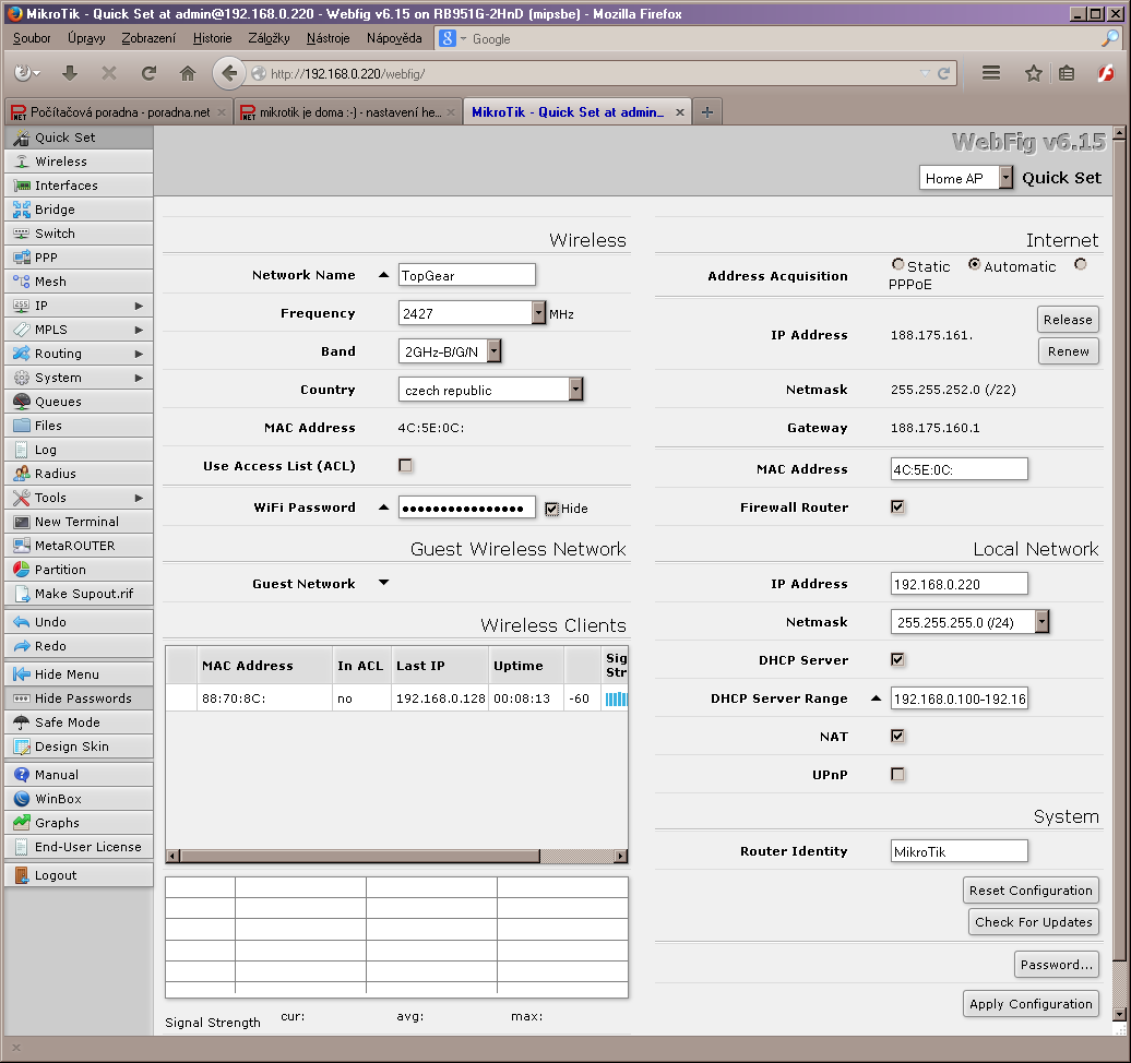 tak router, Mikrotik RB941-2nD, mám zapojený. Hned se mi objevila hláška od provozovatele, že ho mám kontaktovat, že proběhla nějaká změna a oni jí musí povolit. Tak jsem tam volala a do 10 min. vše fungovalo. Zřejmě se tam přihlásil za mě, protože jsem nemusela zadávat ani uživatelské jméno a jsem v routeru. Ani bych do něj asi nemusela, protože mobil mi ho vyhledal a připojila jsem se, ale není zaheslovaný, takže bych chtěla nějak zadat heslo. Podle návodu, co tu mám od posledně to bude asi někde v tom Wireless, ale anglicky neumim, takže nevim, kam tam dál :-D Prosím poraďte :-)