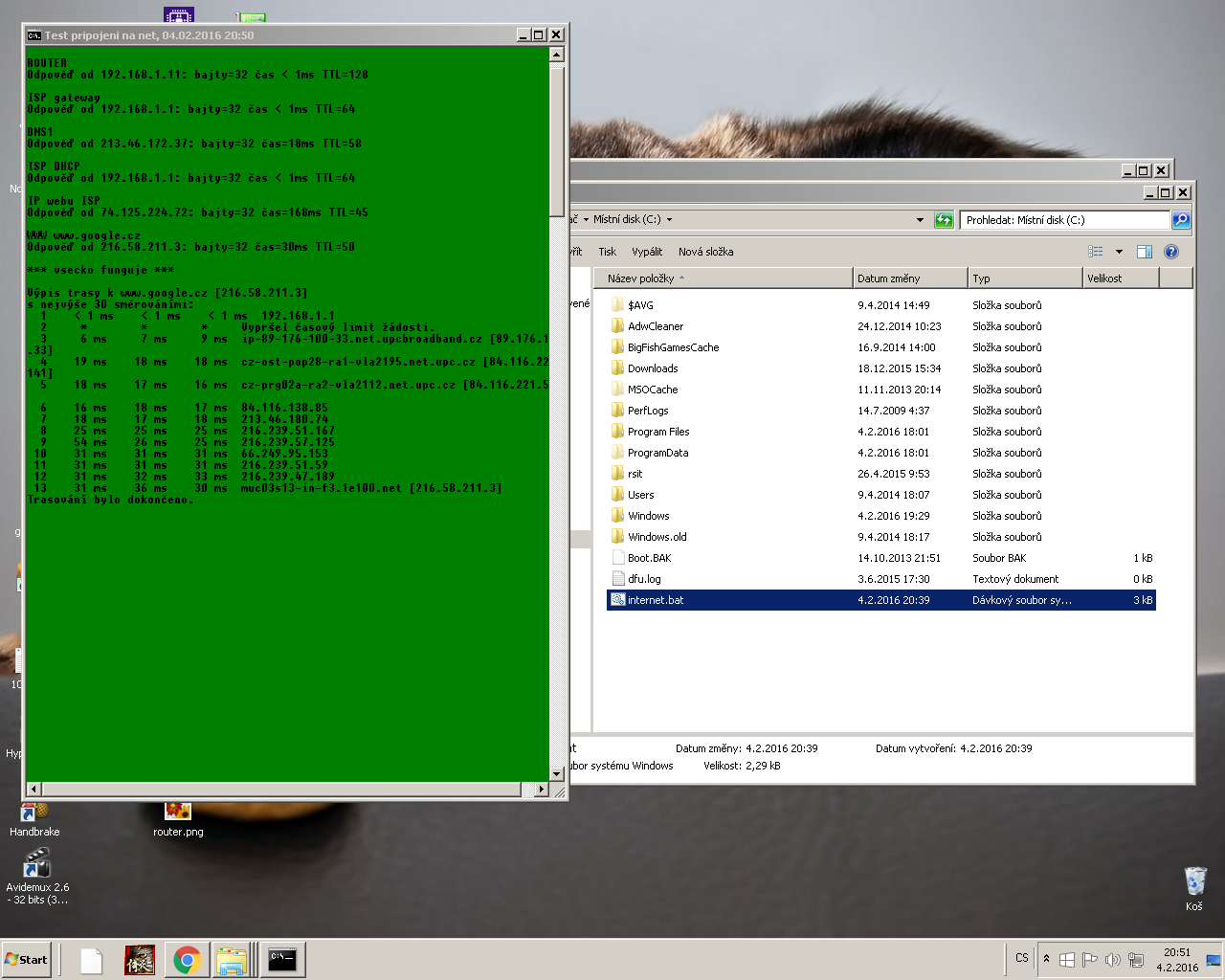 abych nemusel začít zjišťovat ip adresy až při poruše, mám na to udělátor - batku s příkazy, která postupně projde router a servery poskytovatele (isp) a měla by určit, kde je chyba. pro nahlášení závady je tam vyplněný i kontakt.