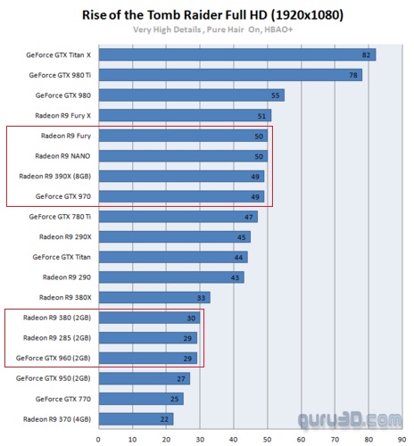 • Ono zalezi i na technologii samotného grafického chipu, kde kuprikladu, zamerime-li se na posledni hry co vysli, kuprikladu Tomb Raider /2016, kde je <GTX960> na urovni <AMD 380>, nebo <GTX970> s 3.5Gb V-RAM na urovni AMD R9 390X s 8Gb , nebo R9 Fury/Nano.