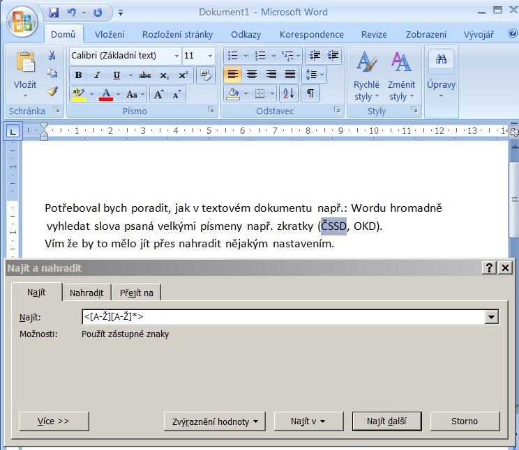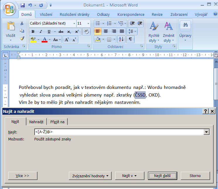 Potřeboval bych poradit, jak v textovém dokumentu např.: Wordu hromadně vyhledat slova psaná velkými písmeny např. zkratky (ČSSD, OKD.