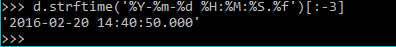 Myslím tohle .strftime('%Y-%m-%d %H:%M:%S.%f') ale výsledek je špatný.. 2016-02-20 15:09:28.%f