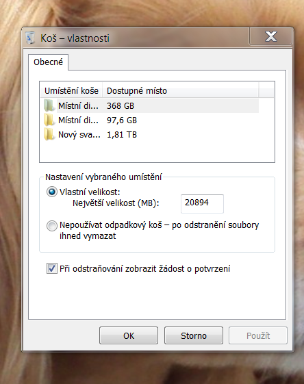 Tam je nastavení klik myší na koš vlastnosti mazat rovnou nebo velikost.