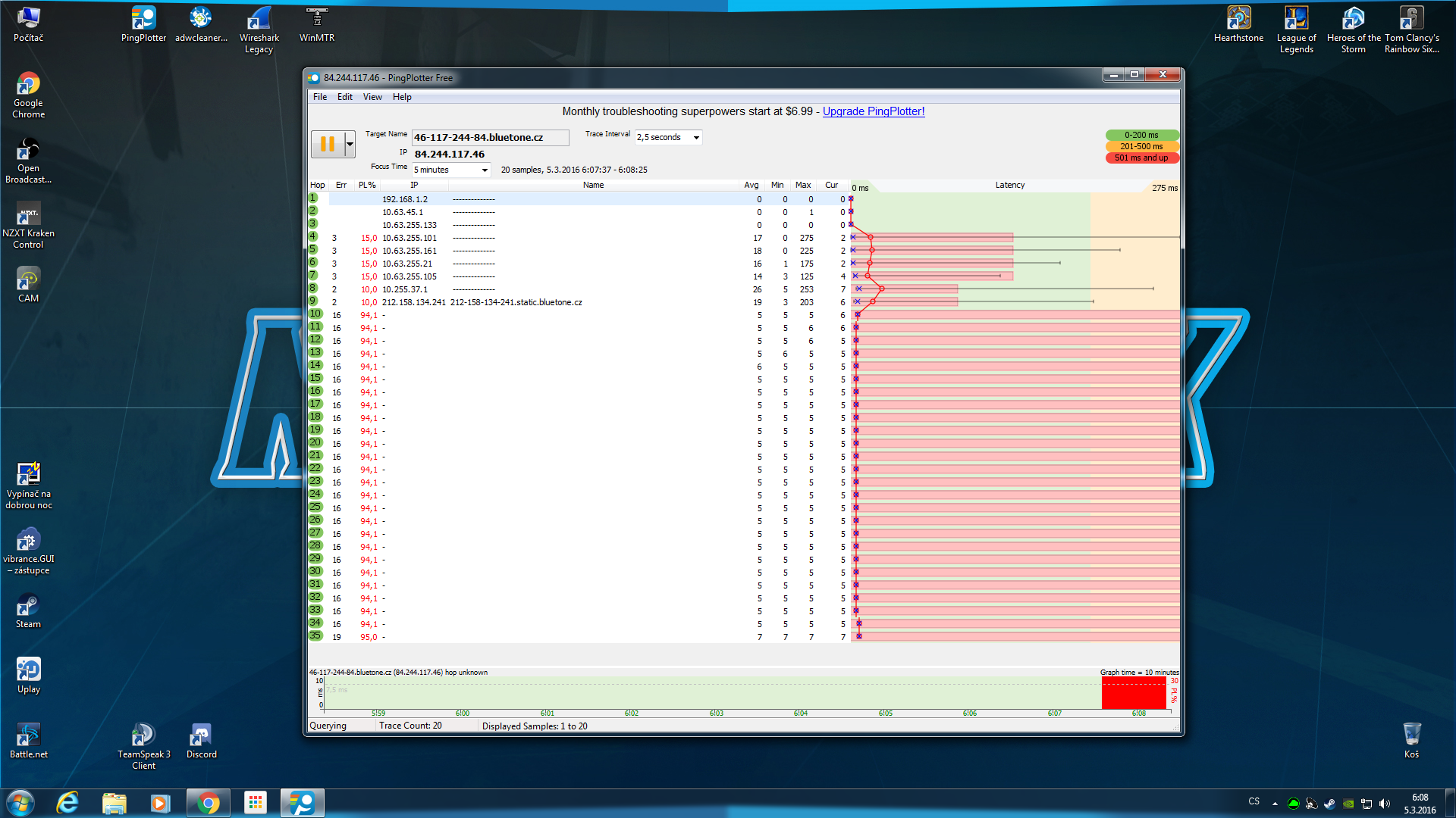 zde mate odkaz,kde to merim programem WINmtr + ping ploter o par hodin dele ,jako duukaz,ale uz fakt nevim co delat(jeste jsem zkousel nejaky program wireshark,ale tomu sem vubec nerozumel,ale porad tam neco svitilo cervene pri mereni)..zkousel sel novej router a nic.novou sitovou kartu a nic. noveho zakaznika a nic.. kazdej ma packet loss..jelikoz streamuji tak me to dost svte,jelikoz to stream automaticky odpoji pri 5% packet loss a vice.. nevedel by nekdo kde hledat chybu ? odpovim na vse a zkusim vse..dekuji predem