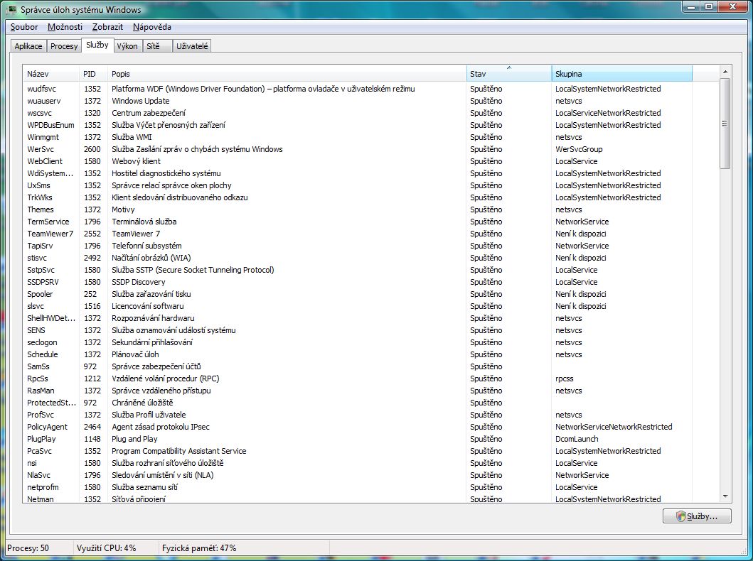 Tak přikládám snímky obrazovky: základ - přehled procesů, služby, které pod ním běží. Napište mi, co…