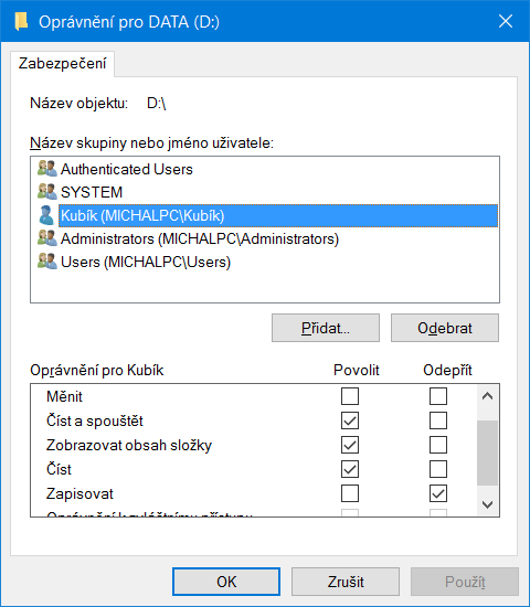 Disky to mají s právy maličko jinak než pak následně složky na nich.