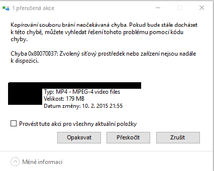 Když tam začnu videa kopírovat, některé se nahrajou, potom vyskočí jedna z hlášek - viz přiložený screen. V tu ránu se v "tento počítač" změní zařízení, jako by nebylo naformátované. Při zadání formátování hlásí (většinou) "Systém windows nemohl dokončit formátování". Zkouším formátovat na NTFS i FAT32.