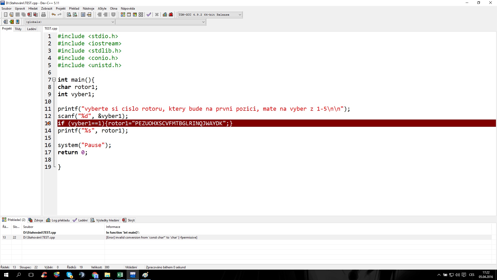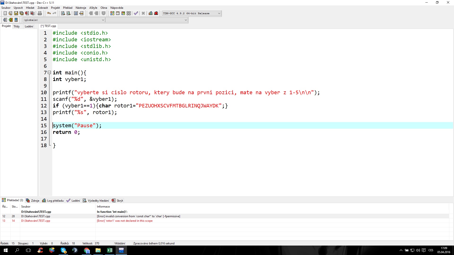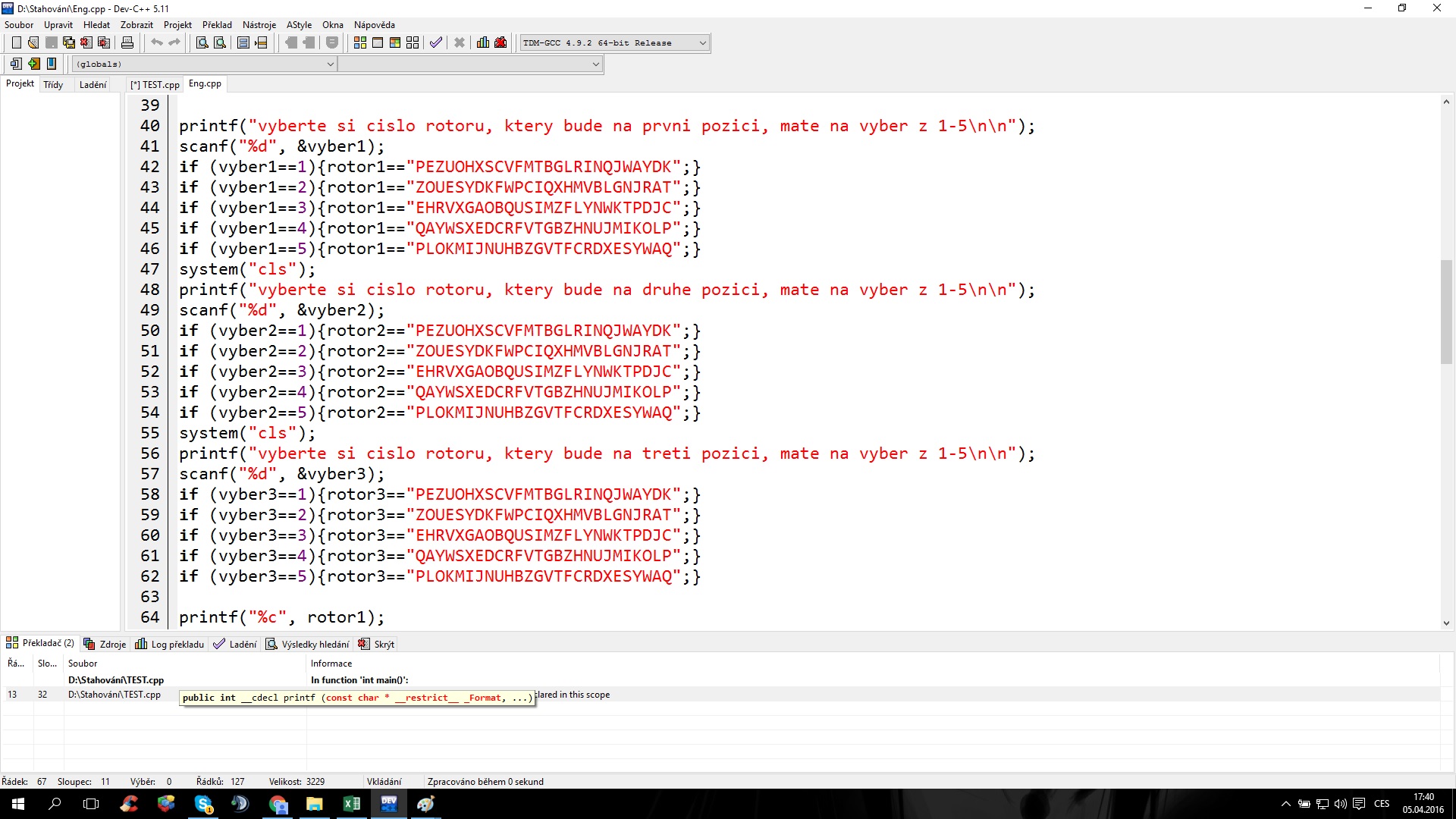 tak daj printf vyber1 a by si vedel, prečo ti nefunguje podmienka rotor1 deklaruj tiež na začiatku p…