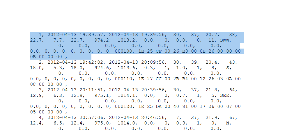 1, 2012-04-13 19:39:57, 2012-04-13 19:39:56, 30, 37, 20.7, 38, 22.7, 7.7, 22.7, 974.2, 1013.2, 0.0, 0, 0.0, 0, 11, SWW, 0, 0.0, 0.0, 0.0, 0.0, 0.0, 0.0, 0.0, 0, 0, 0, 0, 0, 0, 0, 0, 000100, 1E 25 CF 00 26 E3 00 0E 26 00 00 00 0B 00 00 00 ,