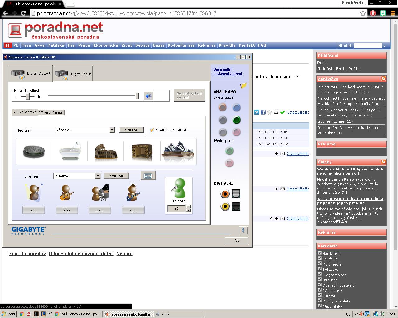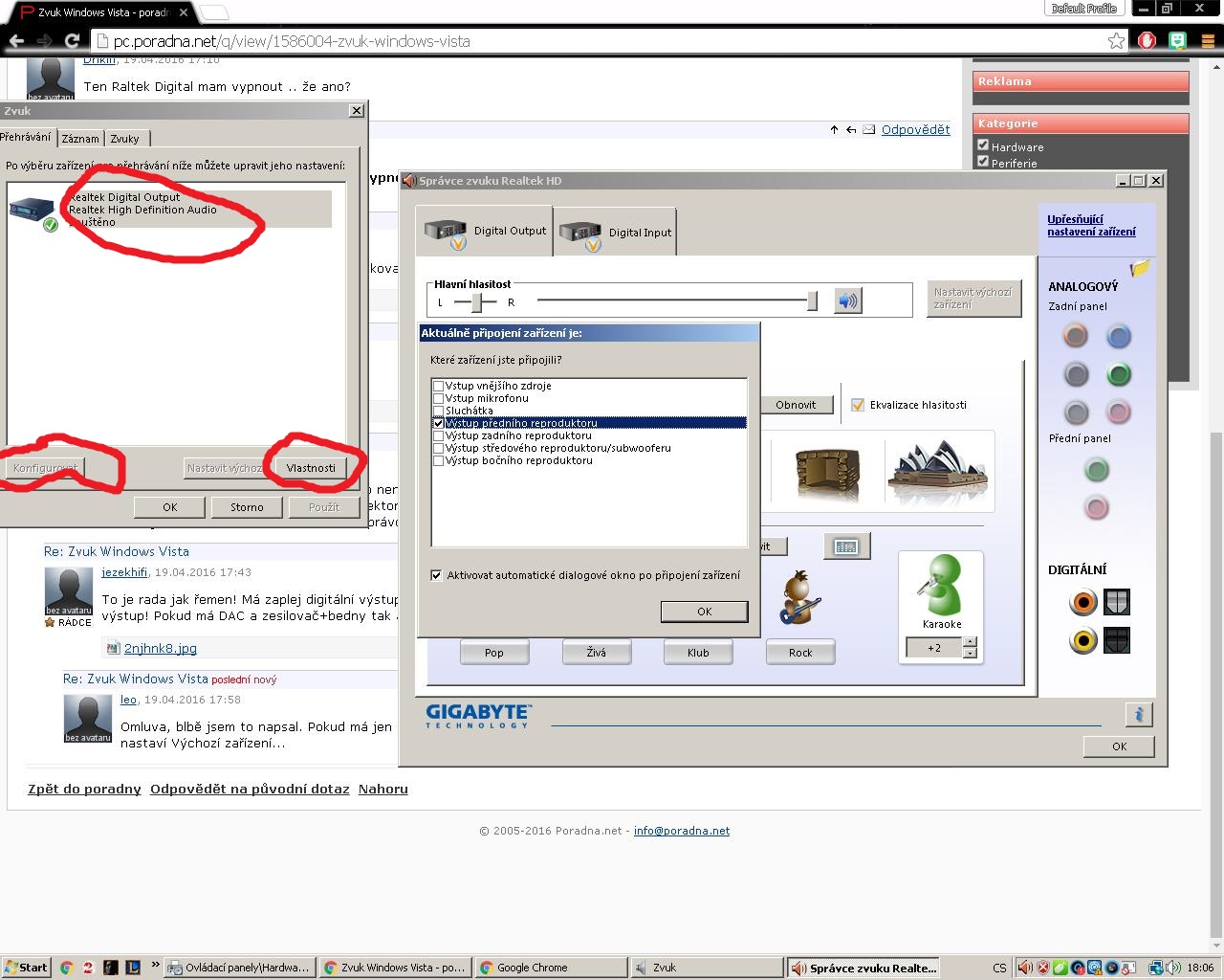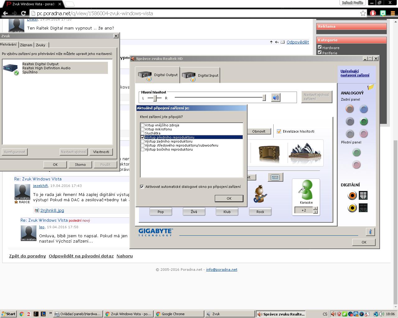 Realtek Digital Output tam klidně nech, tím to není. Musíš mít na tom samém panelu ještě záložku Reproduktory, Směšovač a Mikrofon. Pokud není, je něco špatně, buď ti upadl konektor venku nebo uvnitř bedny, něco se stalo s ovladačem nebo odešla zvuková karta. Nebo zkus ještě rozkliknout další nastavení Správce zvuku Realtek (pravou myší) a bádat.