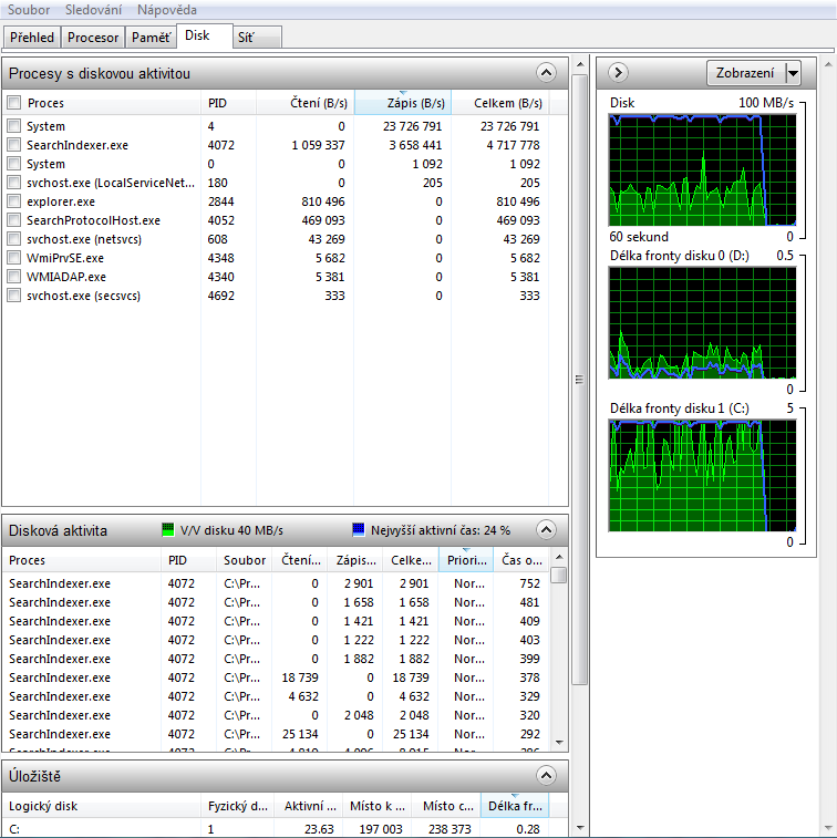 Tak jsem provedl čistou instalaci W7. Vypadalo to, že se počet zapsaných dat nezvašuje - windows update těch 5 GB po zapnutí PC opravdu nezapisuje. Ale bohužel TBW začalo zase přibývat. Koukal jsem do resmon, kde má prakticky vždy nejvyšší zápis proces System (až 8 000 000 B/s). Zajímavé je, když PC nepoužívám a je zapnutý, tak dioda využití disku nepřetržitě svítí, ale když začnu na PC procovat, tak svítit přestane -> klesne zápis procesu System. Chápu, že se na disk stále něco zapisuje, ale přijde mi to moc.