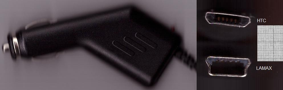 Na obrázku je pro srovnání konektor do autokamery a konektor do smartfounu s kusem milimetrového papíru a zdroj do autozásuvky, ten je v jiném měřítku.