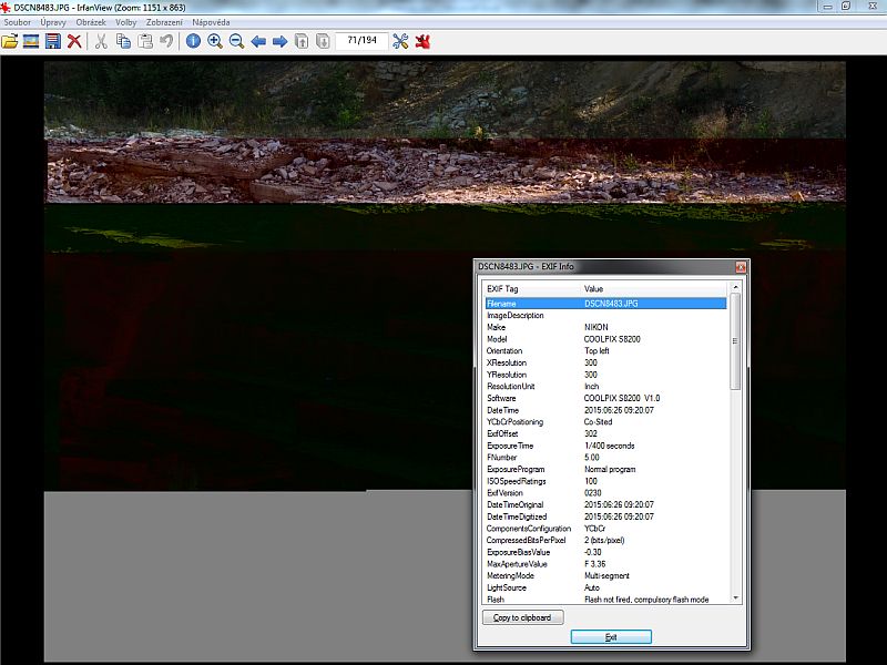 GIMP mi ohlásil, že v obrázku jsou poškozená nějaká data, EXIF ukazuje IrfanView správně, foťák je Nikon S8200 asi 3 roky starý, externí čtečka karet Apacer, Win 7