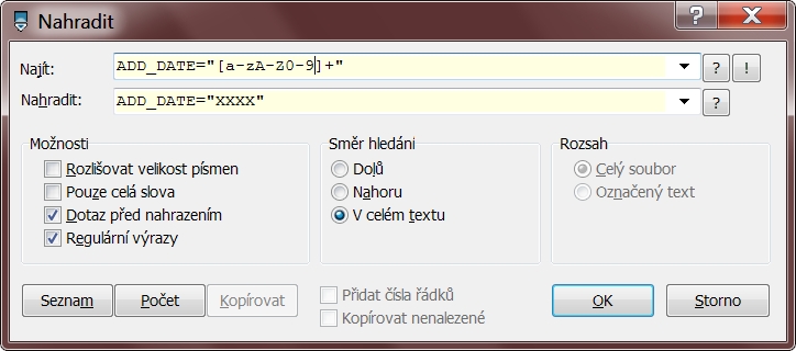 Nebo hledat: add_date=".*?" . je libovolny znak * je libobolny pocet znaku ? znamena, ze skonci u pr… poslední