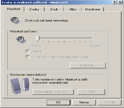 Dobrý deň :) Moj problém je že mi nejde zvuk. Nainštaloval som ovládače a všetky bežia správne. Ale stále nemám ani iknonu hlasitosti na paneli a v ovládacom paneli v nastavenia zvuku mi ukazuje že zvukové zariadenie neexistuje viď foto. Mám windows xp sp3 pro. Neviem čo ďalej. Prosím o pomoc.