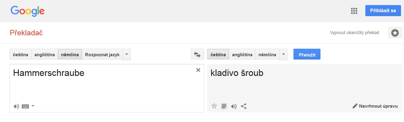 Gouglího transformátor překládá "Hammerschraube" jako "kladivo šroub". To je špatně? Viz. příloha.