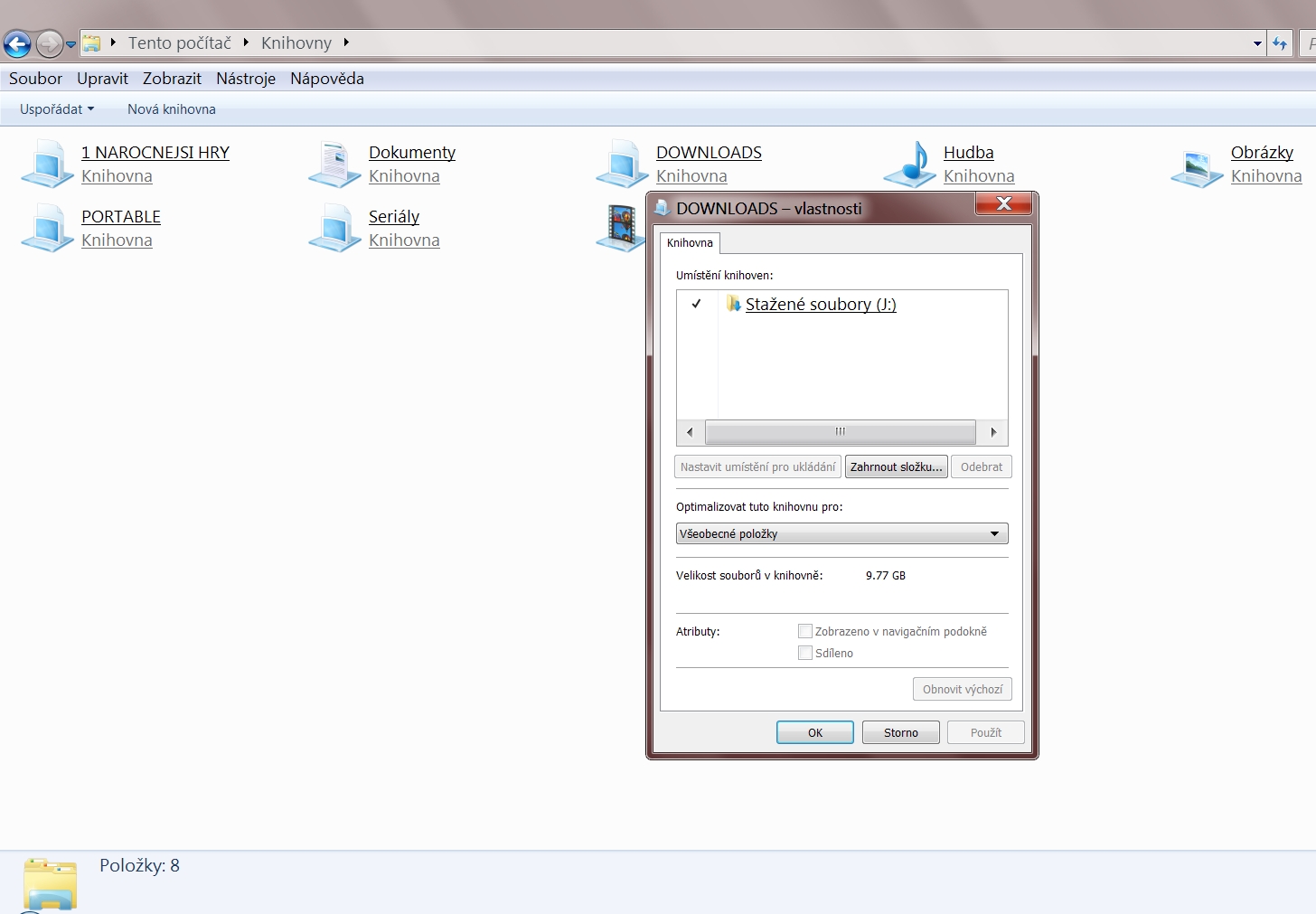 Já vám pořád nerozumím. Vytvořil jsem knihovnu, odkazující na mé uměle vytvořené stažené soubory, ale co to jako vyřešilo? Když dám na vlastnosti, není tam nic jiného než možnost změnit s jakou složkou to spojit. Umístění absolutně ne.