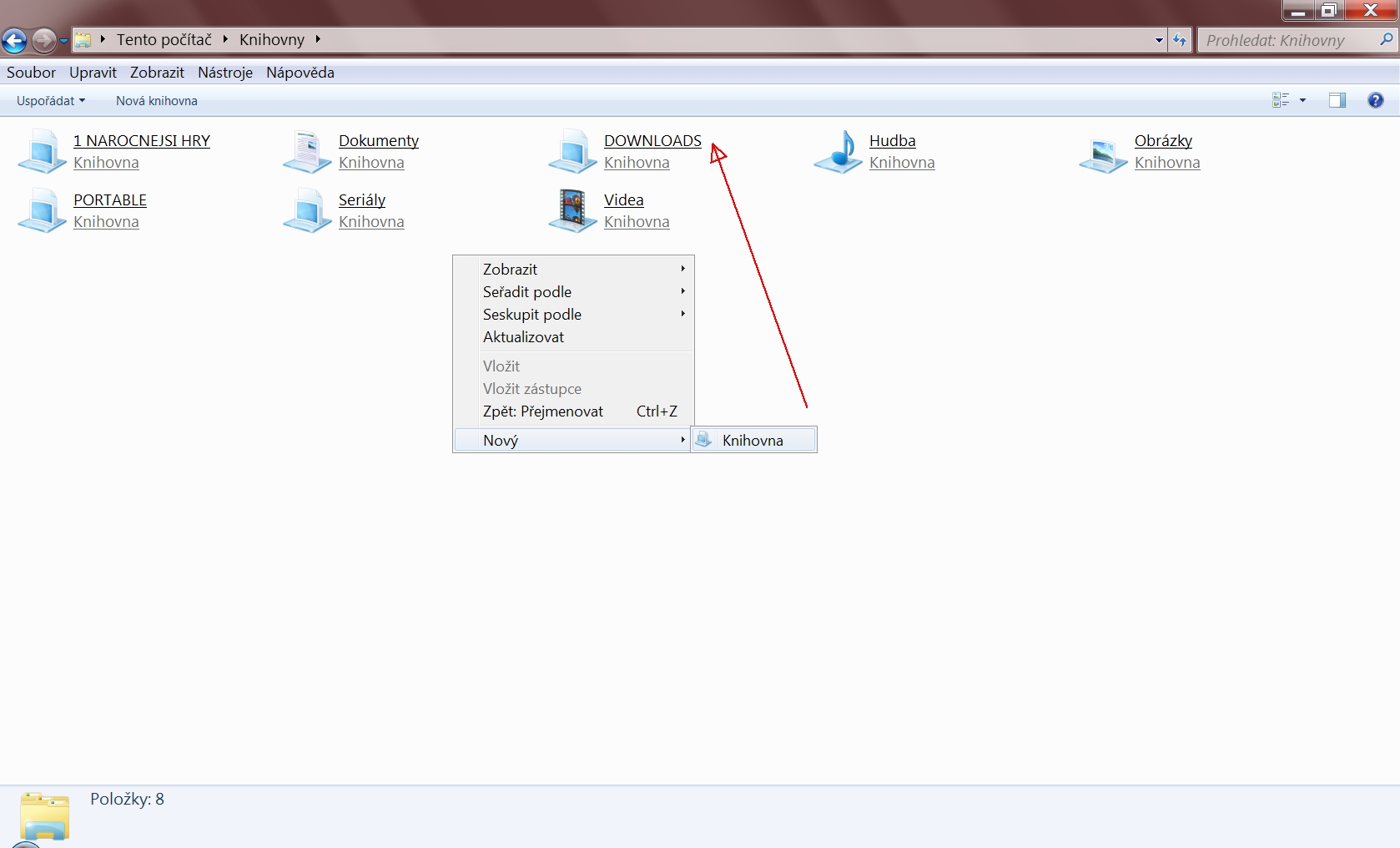 nyní přesně nerozumím. Jak mám jakože vytvořit novou knihovnu? Navíc říkám, moje stažené soubory už nejsou jako původní stažené soubory, už nejsou jako systémová složka USER jako ostatní (plocha, dokumenty, hudba) atd... ale už jsem ji jednou smazal a vytvořil novou, původní. Což ale není stejné, není to jako systémová složka USER...