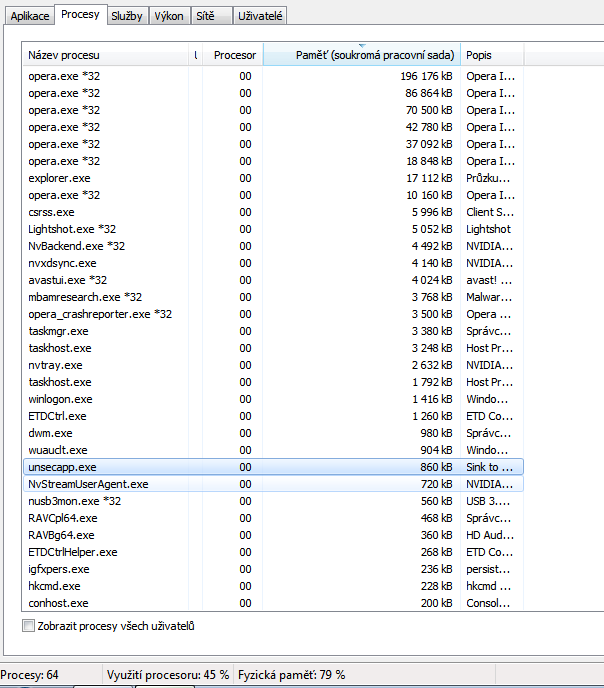 využití cpu je 45%: proč si to teda nesetřídíš podle zátěže cpu? proč si nezobrazíš sloupec s celými…