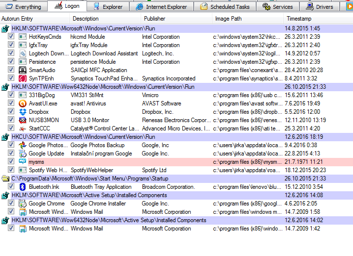 EDIT: MS Autoruns (pravděpodobně) nic podezřelého neobjevil (viz screeny).