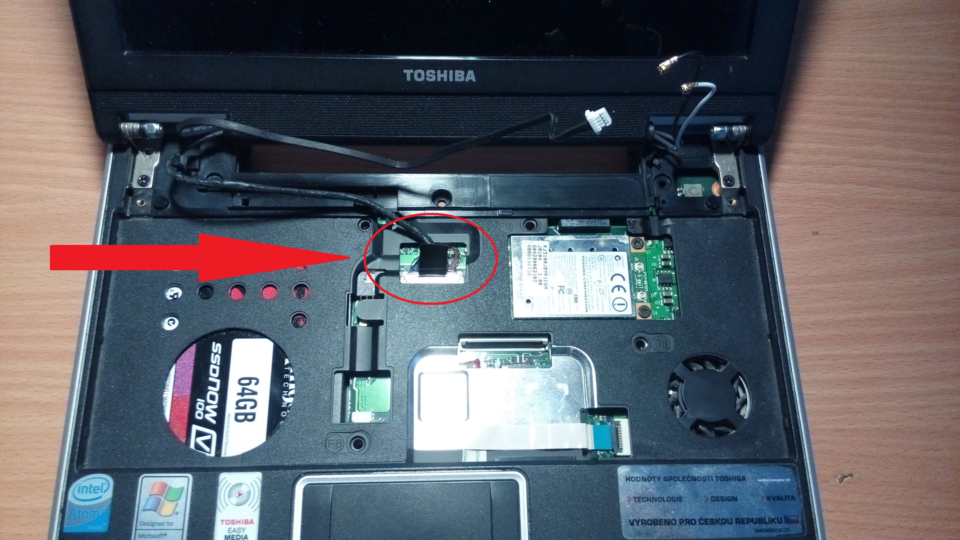 Jen tak mezi náma, na vyčištění a dokonce ani na vyndání disku ten konektor nepotřebujete odpojovat. Při troše šikovnosti ten horní kryt sundáte i tak: http://netbookitalia.it/toshiba-nb100-guida-al-dis assemblaggio.html