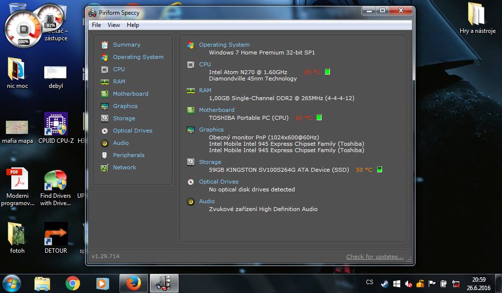 Tohle je ze speccy. RAM i CPU jedou podle miniaplikace ve W7 téměř nonstop kolem 90%. To jsem připisoval jednojádru 1,6 GHz a 1 Gb RAM DDR2 800 MHz.