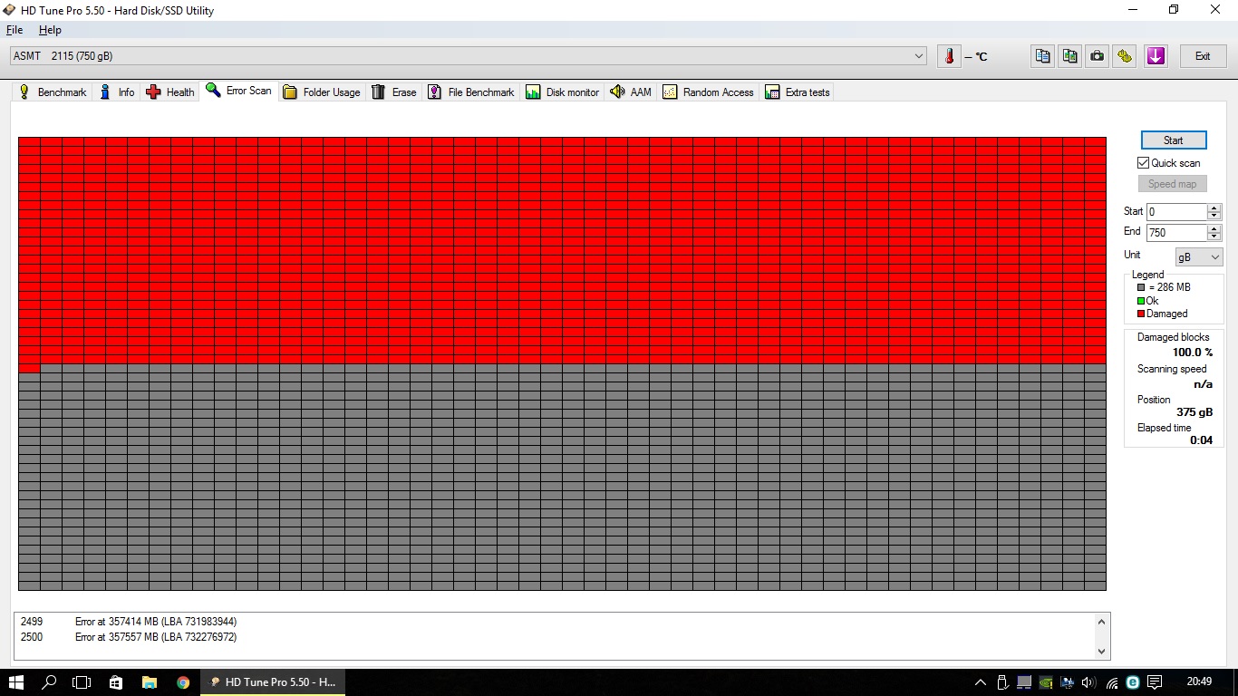 projel sem disk přes hd tune, viz obrázek quick scan, ani to nedojelo do konce a mraky chyb, když odškrtnu quick scan a udělám full scan tak se zobrazí jen dva čtverečky červeně a dál to nejede... blbá otázka, je to asi jasný, ale přes to, disk je na 100% KO že??