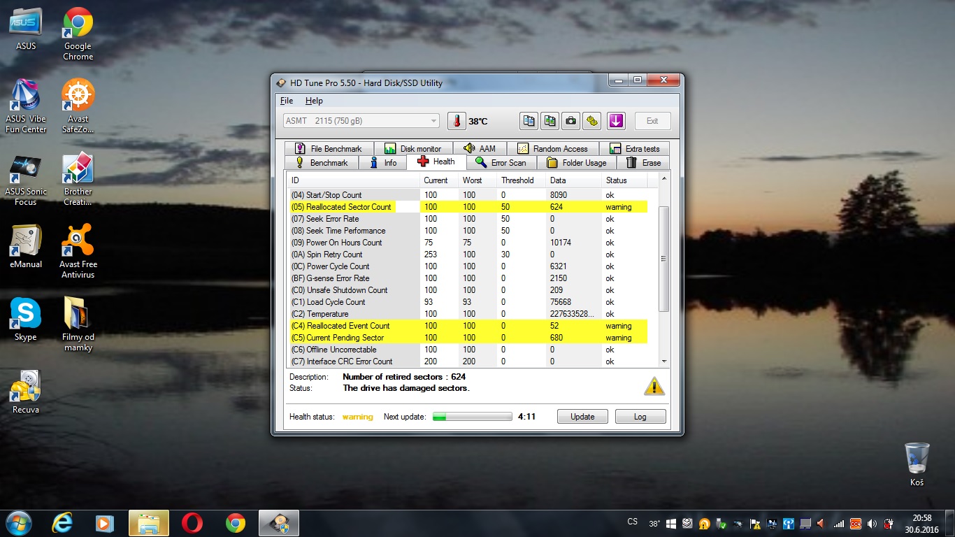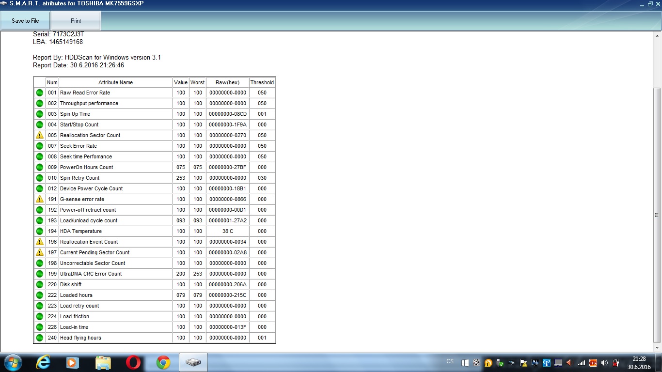 to mě vyhodil ntb s win10, ted dělám test pod win7 a běží normálně se zelenejma čtverečkama... přikládám obrázek, co to znamená? nějaké vadné sektory, nějak opravitelné nebo na vyhození disk?