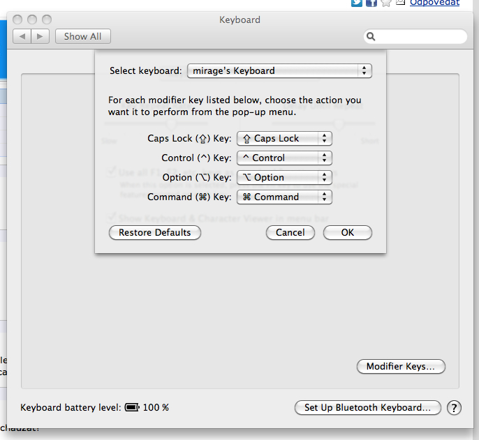 trošku som pozabudol na nutnosť kliknúť v keyboard na modifier keys,tam zvoliť hore z roletového menu príslušnú aktívnu klávesnicu a kliknúť na restore defaults,malo by to znovu aktivovať všetko na pôvodnej klávesnici,viz priložený obrázok