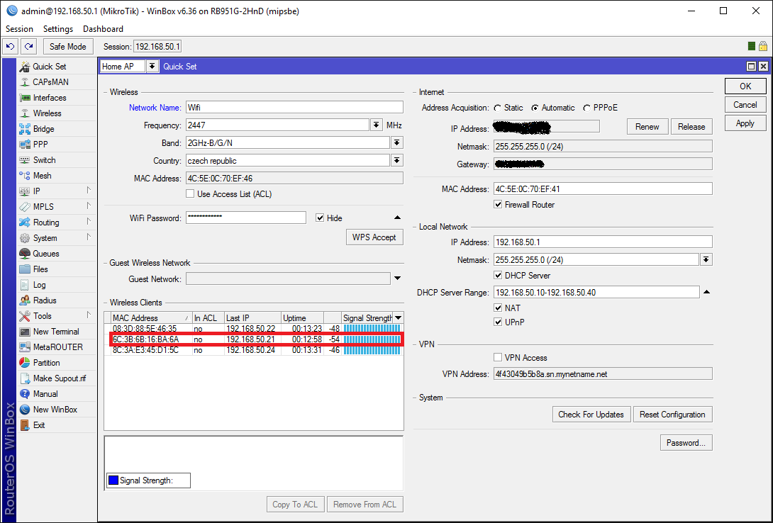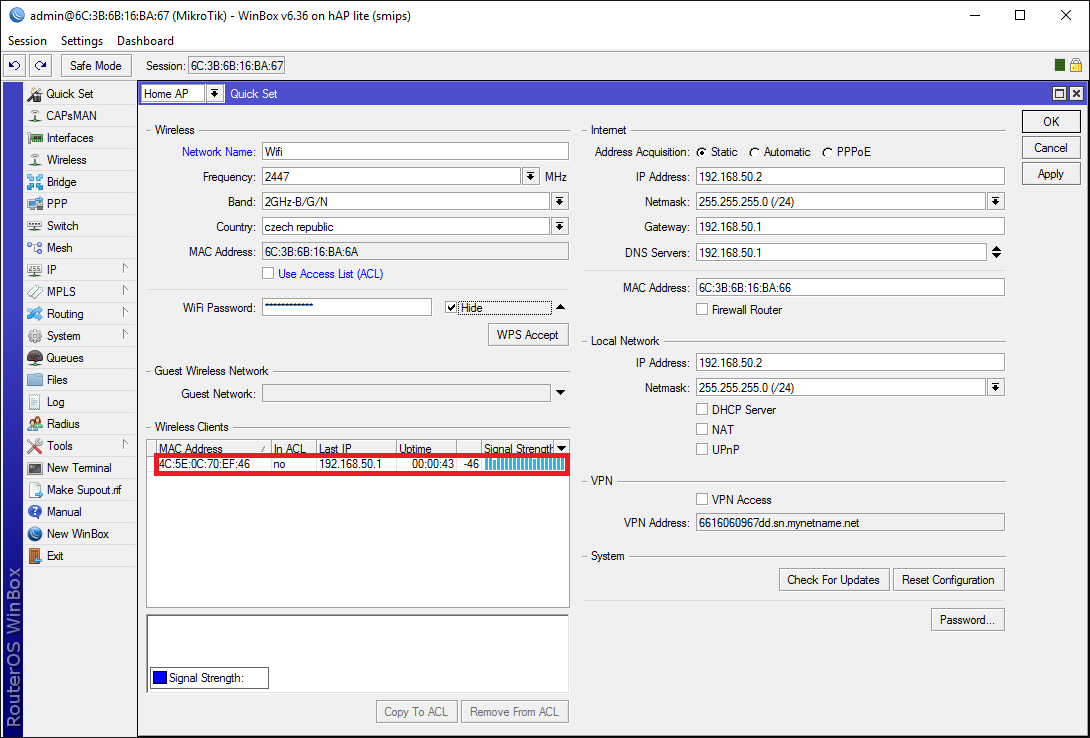 Co se tyka pristupu, pristup pres MAC adresu, pristupuj pres MAC adresu toho WiFi rozhrani, pokud chces pristupovat pres WiFi.