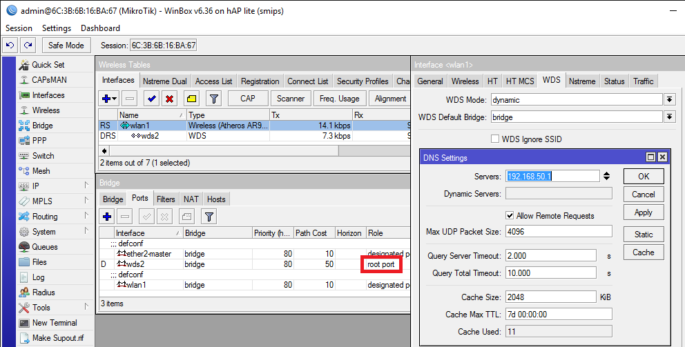 Zde jsem vyznačil odlišnou roli WDS2 portu - root port. Také se v routeru2 jmenuje jinak bridge-local - bridge, to je předpokládám jen o pojmenování.