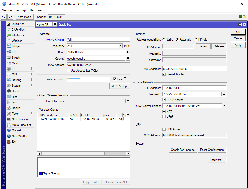 Odpověď na zbytečnou konfiguraci je jednoduchá - dělal jsi zbytečně QuickSet, protože v podstatě všechno (kromě šifrování a SSID wifi) jsi nastavoval potom ručně.