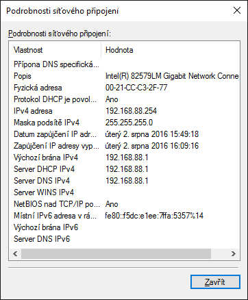 Vlastnosti síťového připojení (při připojení laptopu kabelem k druhému routeru):