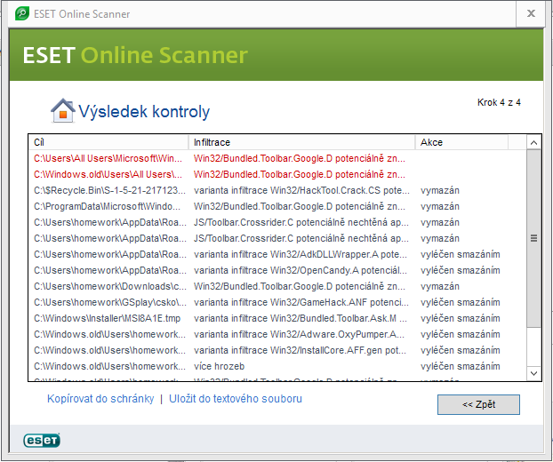 Tak po téměř 8 hodinách ten Eset dokončil scan a našel toto. Mám teď nechat smazat všechny soubory…