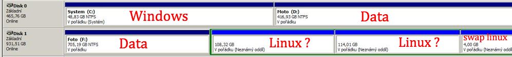 Podivej asi sam chapes, ze sis v tom udelal poradny zmatek, z cehoz je zmatenej i ten linux. Nejlepsi by teda opravdu bylo koupit jeste jeden disk a zalohovat na nej uzivatelska data a poresit to v klidu bez obavy ztraty dat, ke ktere stejne muze kdykoli dojit, nikdy nevis, kdy disk odejde a dneskajsou bohuzel se spolehlivosti dost na stiru.
