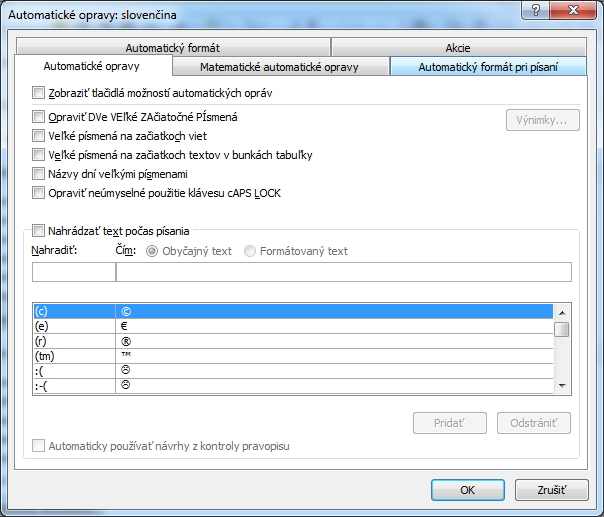Karta Súbor - Možnosti - Kontrola pravopisu a gramatiky - Možnosti automatických opráv