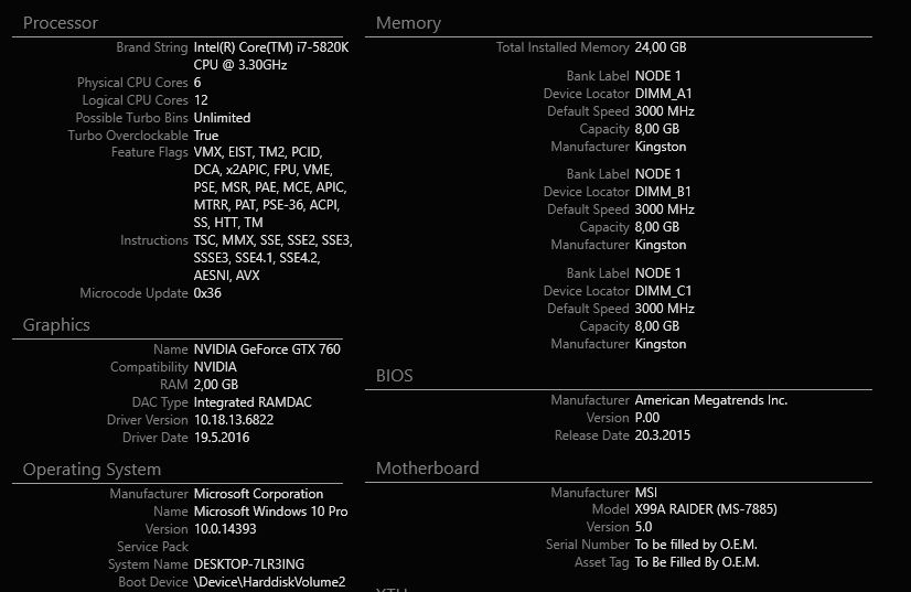 Dobry den mam jeden problem s taktovanim ramky cez XMP profil. Mam pc I7 5820 k v zakladom takte a ramky 3x 8gb 3000Mhz znacky Kingston, dosku MSI x99a RAIDER a chladic na doske Noctua NH-D15S. Ramky bezia na prvom XMP profile na takte 2666Mhz a druhy profil mi umoznuje dat na 3000 Mhz. Problem je ten, ze ked to dam na 3000mhz pocitac nenabehne a ziada si reset biosu. Bios mam aktualizovany a myslel som si ze problem sa tym vyriesi. Moze byt problem vysoke alebo nizke napatie v profile alebo ide o problem dosky alebo ramky? Vacsina ludi ktori takto taktuju ramku cez XMP tak nemaju s tym problem CPU z im ukazuje 1500 frekvenciu. Kde je teda chyba u mna nepomohli mi ziadne fora ani youtube. Dakujem