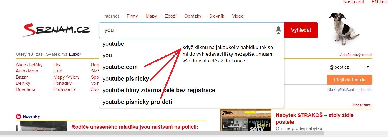 Prostě když zadávám něco do vyhledávače tak mi vyjede několik nabídek,ale žádná nereaguje na kliknutí,aby se mi přepsala do toho okna pro hledání...vždy musím napsat celý text...Neví někdo co kde povolit aby se mi nabídnutý text zapsal po kliku do vyhledávacího pole?
