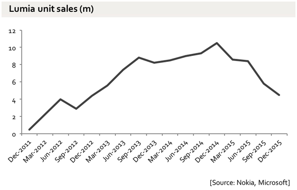 Protože textu dnes už skoro nikdo nevěří a jeden obrázek řekne mnohem víc, tohle jsou prodeje mobilních Windows. Doba největší slávy, kdy se dal příležitostně na ulici potkat další fanda, je pryč, nové Lumie se neprodávají, už by to chtělo modernizaci, ale ta není a třeba už ani nebude. Nejsou prodeje, nejsou uživatelé. Pro systém bez uživatelů nebude nikdo rozumný psát aplikace a systém bez aplikací je v dnešní době nepoužitelný a mrtvý i kdyby byl sebelepší.