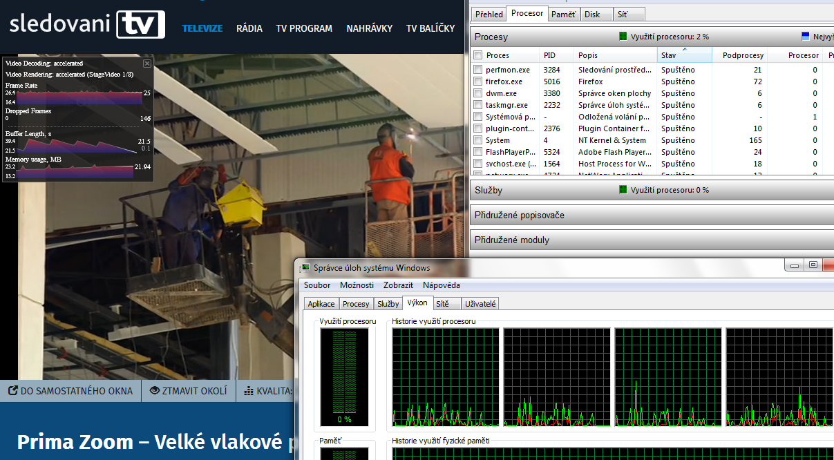 Teď jsem zkoušel Zoom, výsledek ve screenshotu. Zatížení nula nikde nic. PC je 3 roky starý (ale ne plečka). Mimochodem, funguje mi to plynule i na android tabletu, stoletém noťasu a smart TV (tam to mám jen vyzkoušené, v TV internet nepotřebuji). Funguje to bez problémů i na iPhonech 4 a 5.