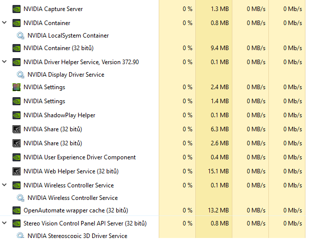 Ahoj, mám takový problém s mojí grafikou Nvidia 960M. Když zapnu ntb, tak grafika nejeví aktivitu, pak zapnu hru, grafika se aktivuje a poté, co hru vypnu, tak ve sledování aktivity jednotky zůstane nějaký proces nazvaný nvidia (viz screenshot) až do té doby, co zase zrestartuju ntb. Mám nejvnovější ovladače 372.90 z 21.9.2016, k tomu nainstalovaný program Nvidia Experience ve verzi 3.0.7.34. Ještě přikládám screenshot ze Správce úloh - toto jsou jediné procesy, které běží pod Nvidií. Nevíte někdo, který proces může takhle zůstat viset ve sledování aktivity? Podle GPU-Z je zátěž na 0%, takže proces nejspíš grafiku nijak nevytěžuje, ale stejně si myslím, že by tam nemělo nic být.