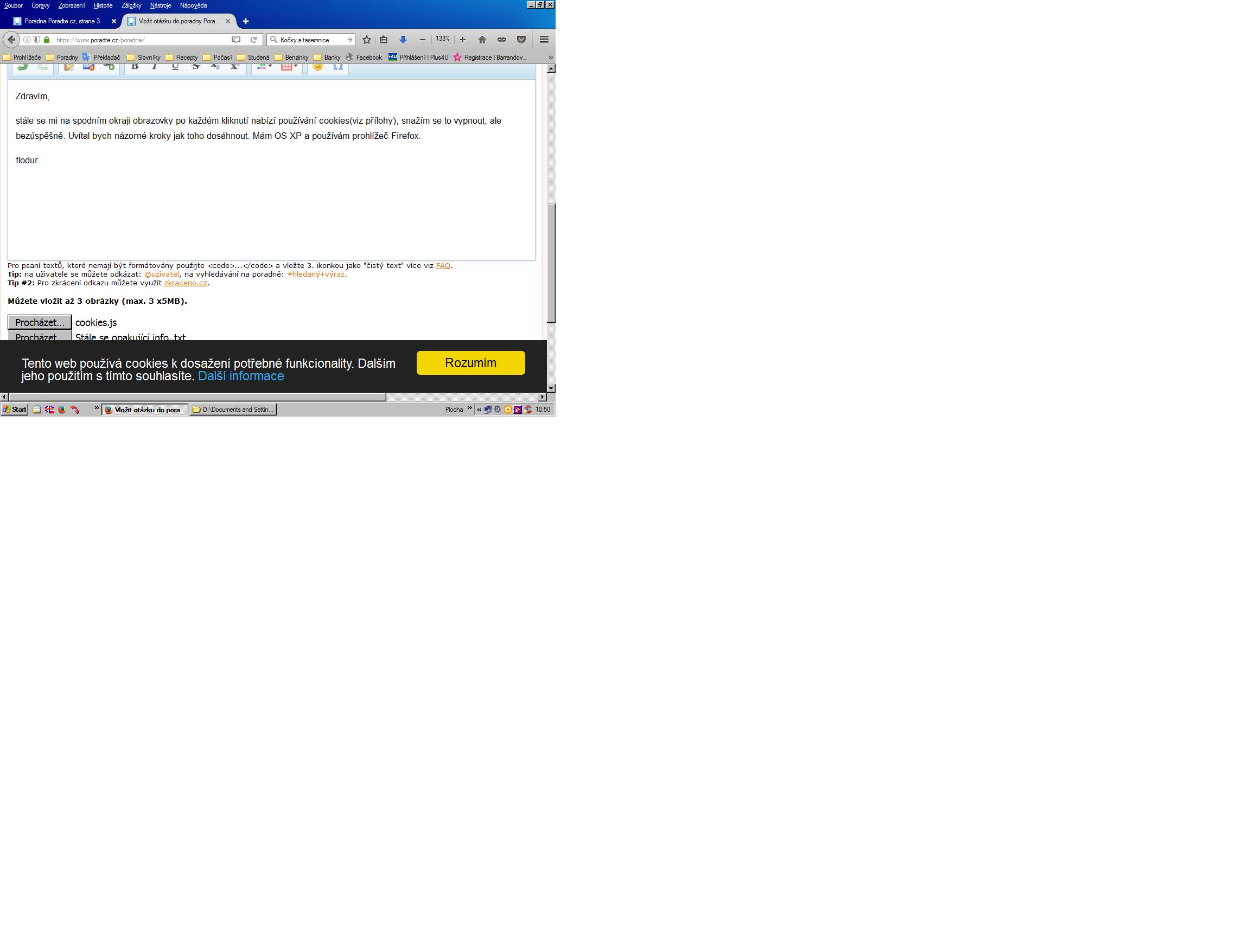 stále se mi na spodním okraji obrazovky nabízí využívání souborů cookie(viz příloha).Pokoušel jsem se v nabídce o vypnutí cookií, ale bezvýsledně. Uvítal bych radu jak správně postupovat abych se té info dole zbavil.OS mám XP a prohlížeč Firefox.
