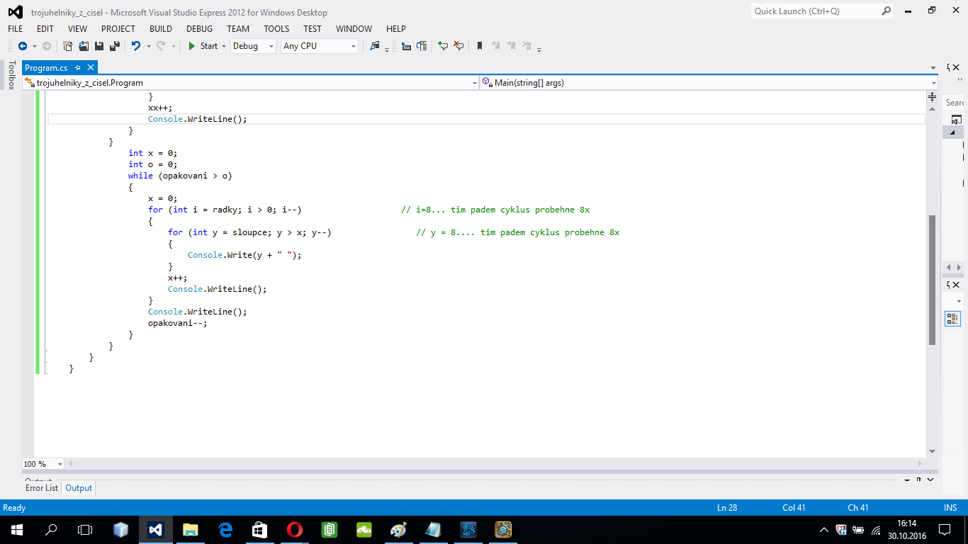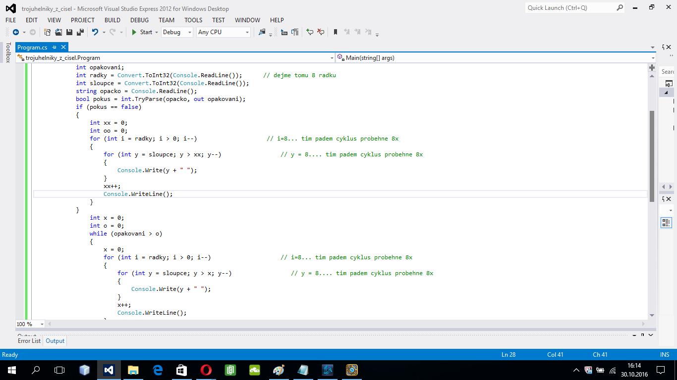 Kód pro výpis trojúhelníku tam máš dvakrát, to je samo o sobě zásadní chyba.