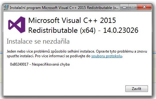 po odinstalovaní knihoven a direktu mi nejde nainstalovat microsoft visual c++ 2015 ke konci instalace nastane chyba