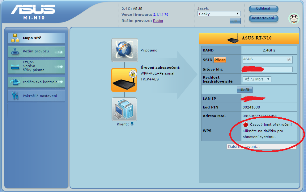 doma používám router Asus RT-N10, přes který se přostřednictvím Wifi připojuji k internetu. Z ničeho nic mě wifi připojení přestalo fungovat doma na dvou notebookách. Je zajímavé že k wifi jsem se připojil přes svůj mobilní telefon, bez problému. Pokud jsem do routeru vložil kabel a propojil se ke svému nootebooku, tak jsem se k internetu připojil. Svůj notebook jsem vzal a mimo domov jsem se k jiné wifi připojil také bez problému. Oslovil jsem poskytovatele připojení a tem mi sdělil, že u nich problém není. Nakonec jsem se dostal do nastavení routru ale nebyl jsem z toho moc moudrý. Jediné podezřelé co jsem v nastavení našel bylo u záložky WPS -"Časový limit překročen. Klikněte na tlačítko pro obnovení systému." - což jsem udělal s negativním výsledkem. Zkoušel jsem router vypnout a zapnout taky bez výsledně